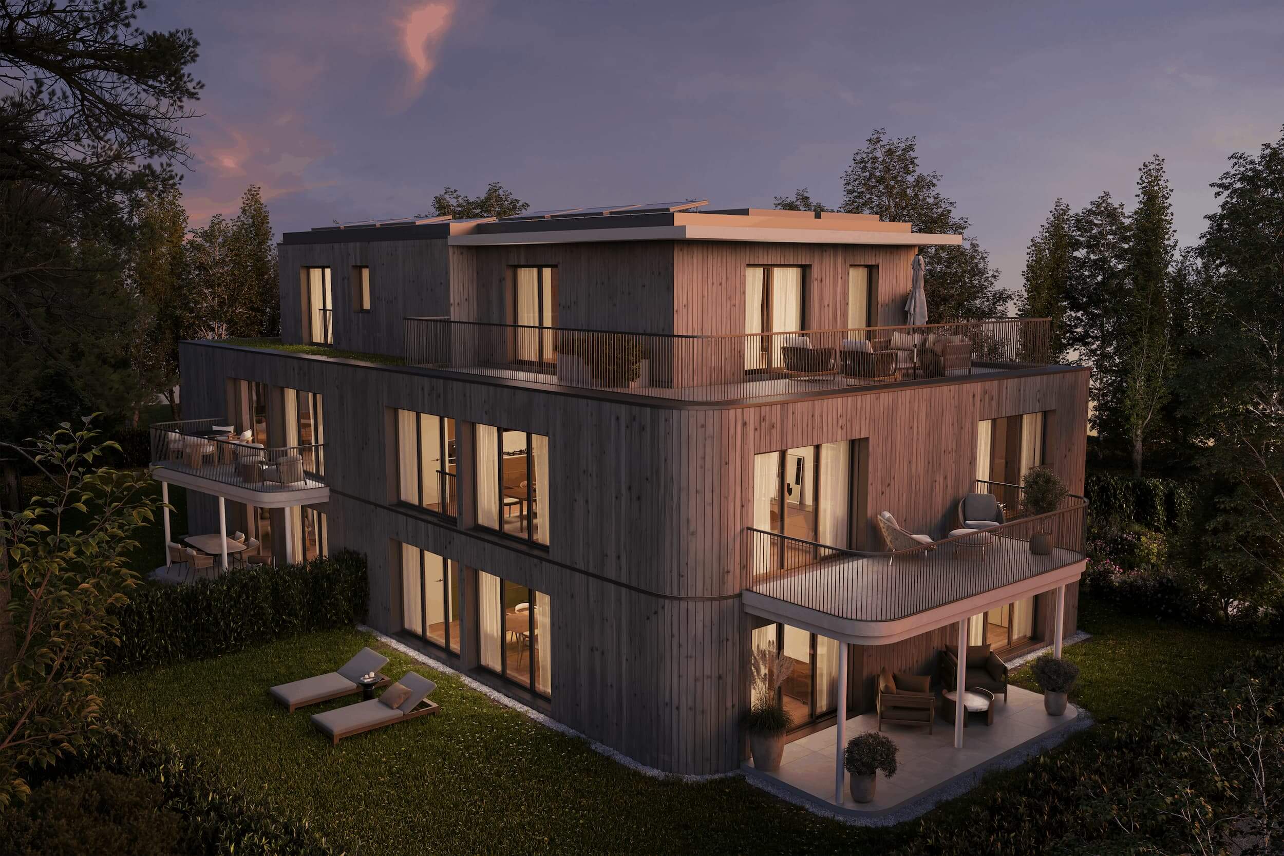 La façade en bois d’épicéa, noble et élégante, donne son nom au projet et affirme son identité. Ce matériau naturel confère à la résidence une esthétique à la fois moderne et intemporelle, parfaitement intégrée à son environnement.